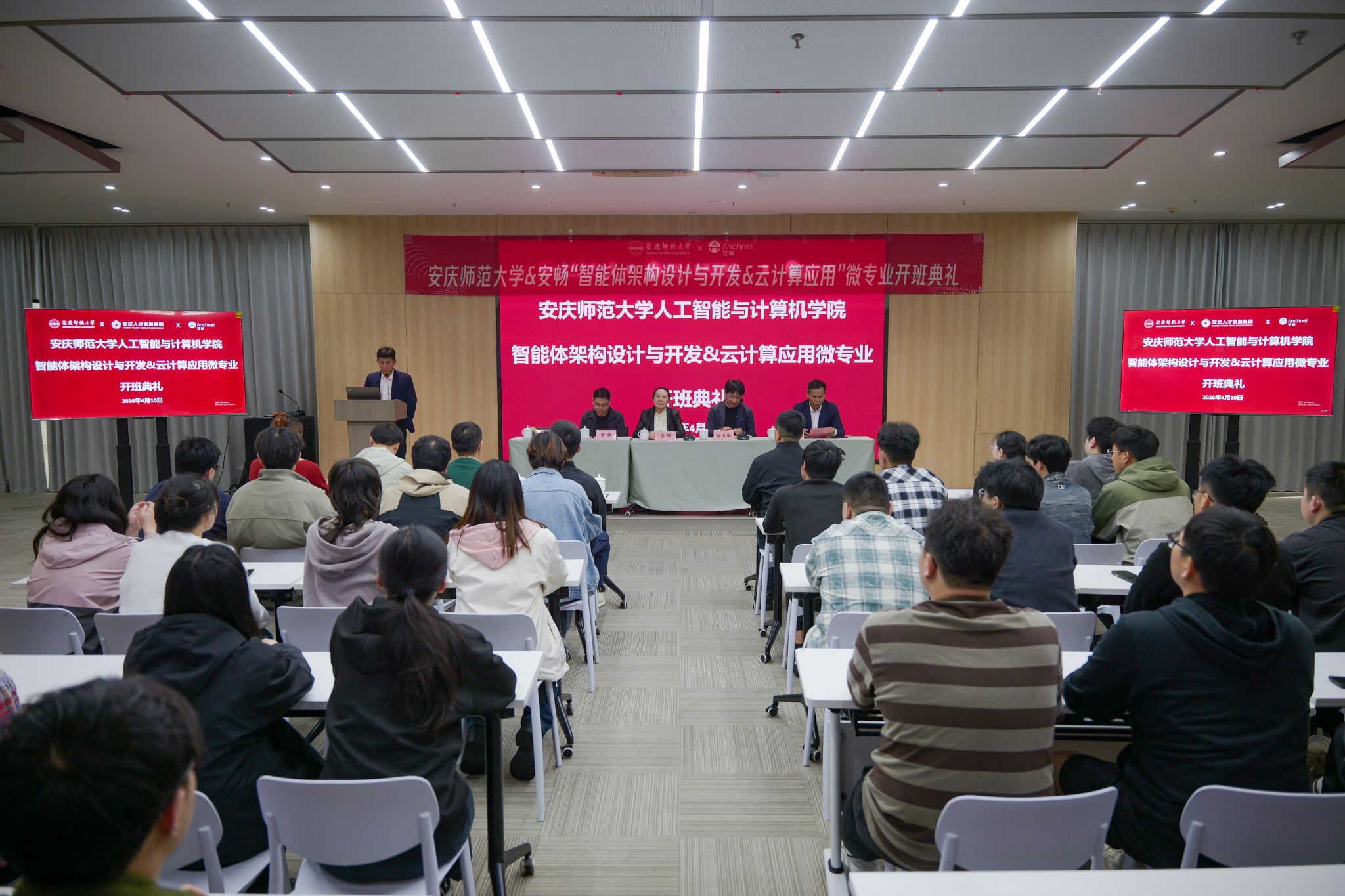 4月10日,学校首期“智能体架构设计与开发”与第三期“云计算应用”微专业同步举行开班典礼。校党委常委、副校长吴琼出席典礼。安畅集团董事长程小中,安庆市人才集团人才科创产业园公司总经理罗骁等企业嘉宾,学校教务处负责人、人工智能与计算机学院(人工智能产业学院)领导班子成员、教师代表及微专业全体学员参加典礼。